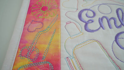 The hoops are held in place with the front flap attached with velcro or kam snaps to the back panel, with the front of the flaps can be customised to add text (NOTE: our two larger samples use the text function on our machine to show hoop sizes, these are not included in the files). The flaps are added to the back panel while still in the hoop.