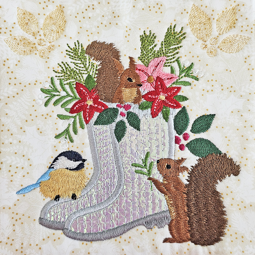 This quilt will consist of 16 blocks (12 different designs) as well as Border and Corner blocks. A new design will be released each Monday leading up to Christmas. Each block can be made in the 4x4, 5x5, 6x6 or 7x7 size hoop. The blocks are quilted in the hoop.