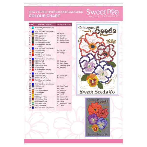 There are a total of 9 blocks in this mystery quilt, with a new release each Monday leading up to Easter. The second block in this year's Spring BOW shows an array of pansies from the Catalogue of Seeds by the Sweet Seeds Co.