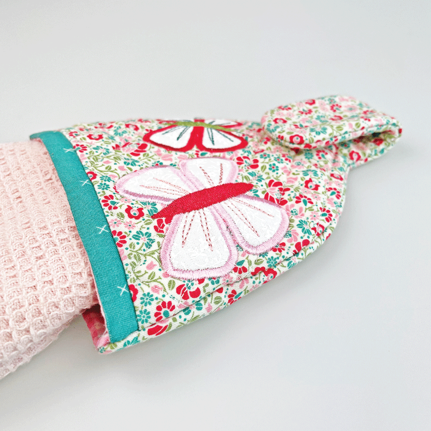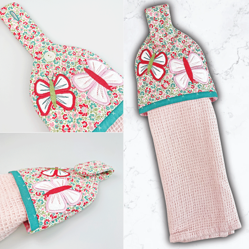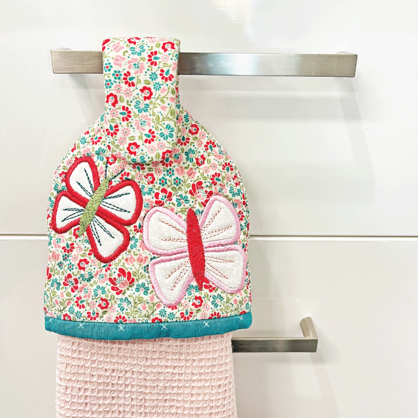 This is a design for a tea towel topper featuring little butterfly appliques.