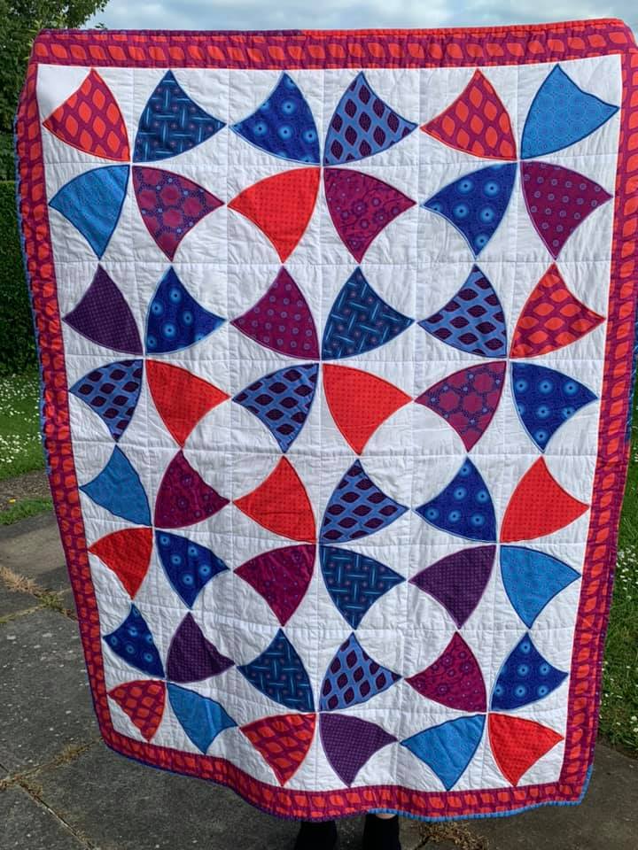 This stunning applique quilt is a machine embroidery design..  There is one fan applique block made in the hoop as many times as you like and then joined with your sewing machine.  The quilting is done in the hoop.