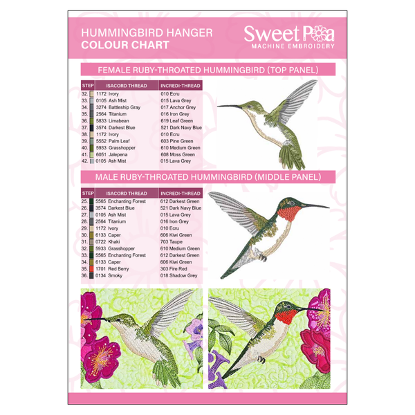 There is a Sweet Pea Incredi-thread colour chart provided with this design if you want to replicate our thread colours for the Hummingbirds. This thread chart only includes steps related to the Hummingbirds.