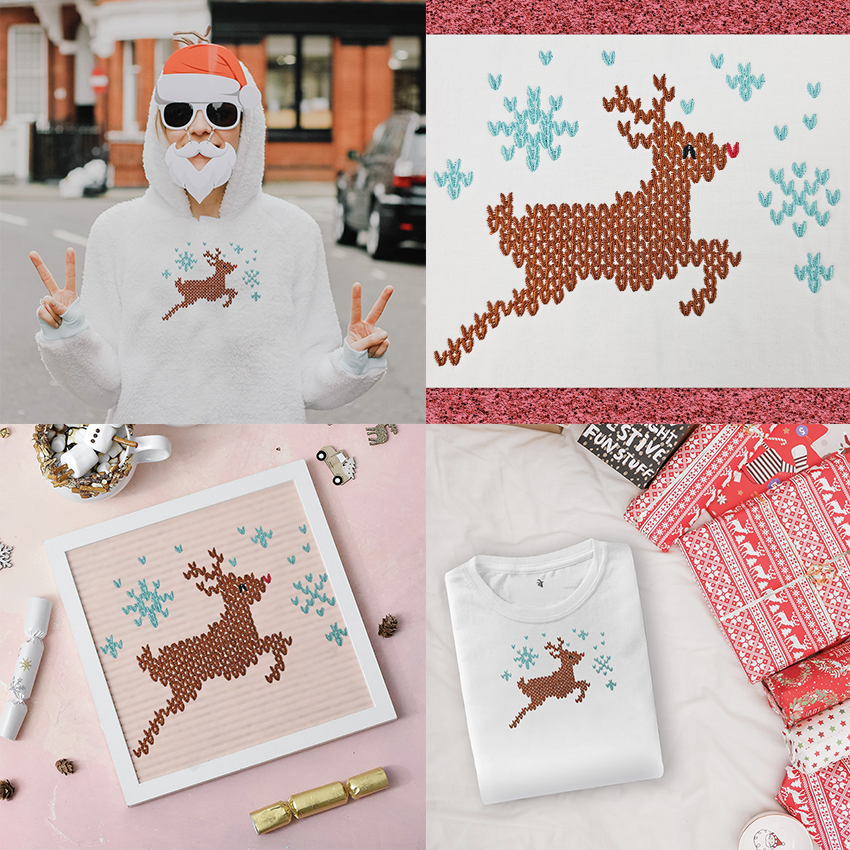 Get this classic flying reindeer knitted embroidery design made in the 5x7 hoop. The design is for the reindeer embroidery only.