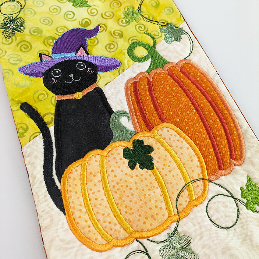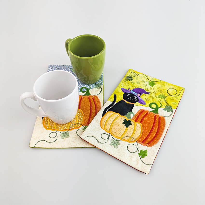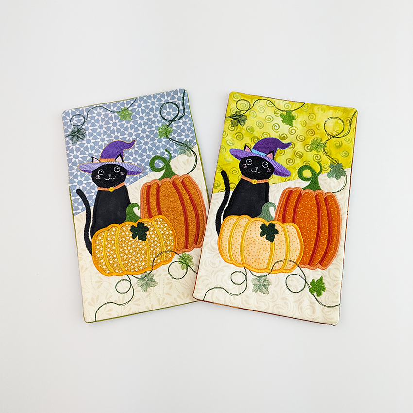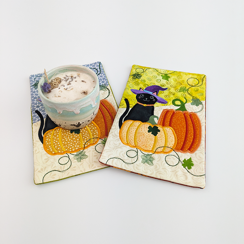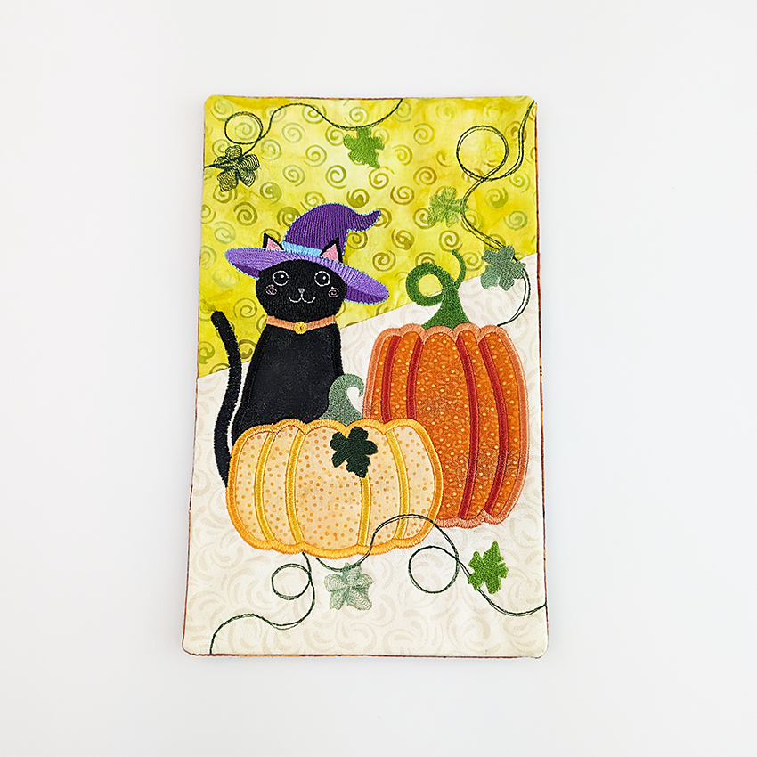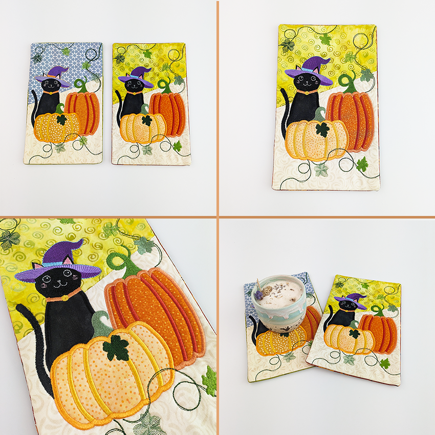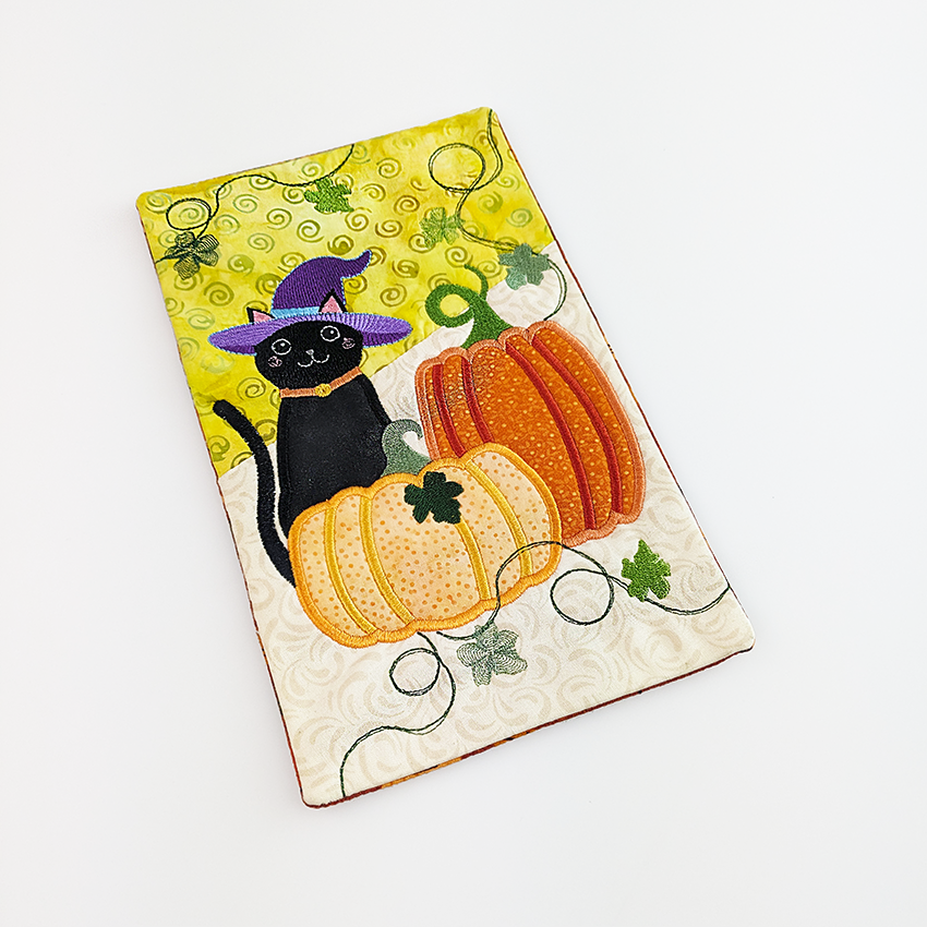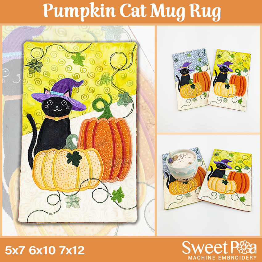 This mug rug features a fun applique and embroidery combo of a spooky pumpkin and witchy cat in the 5x7, 6x10, or 7x12 hoop. All sizes are included when you purchase.